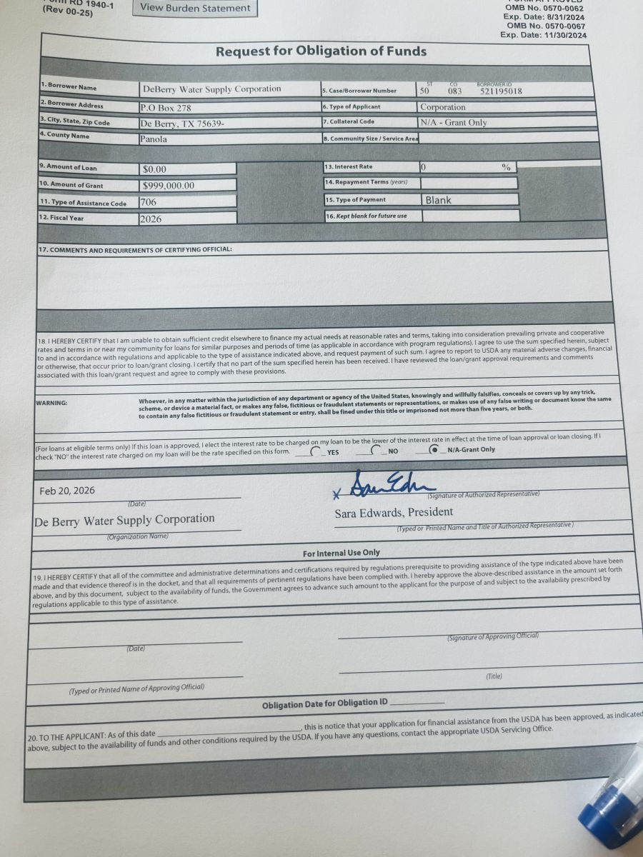 Today, we officially signed the documents confirming approval of the $999,000.00 USDA ECWAG Grant for DeBerry Water Supply Corporation. This is one of the largest and hardest to obtain grants available to rural systems like ours—and WE DID IT.